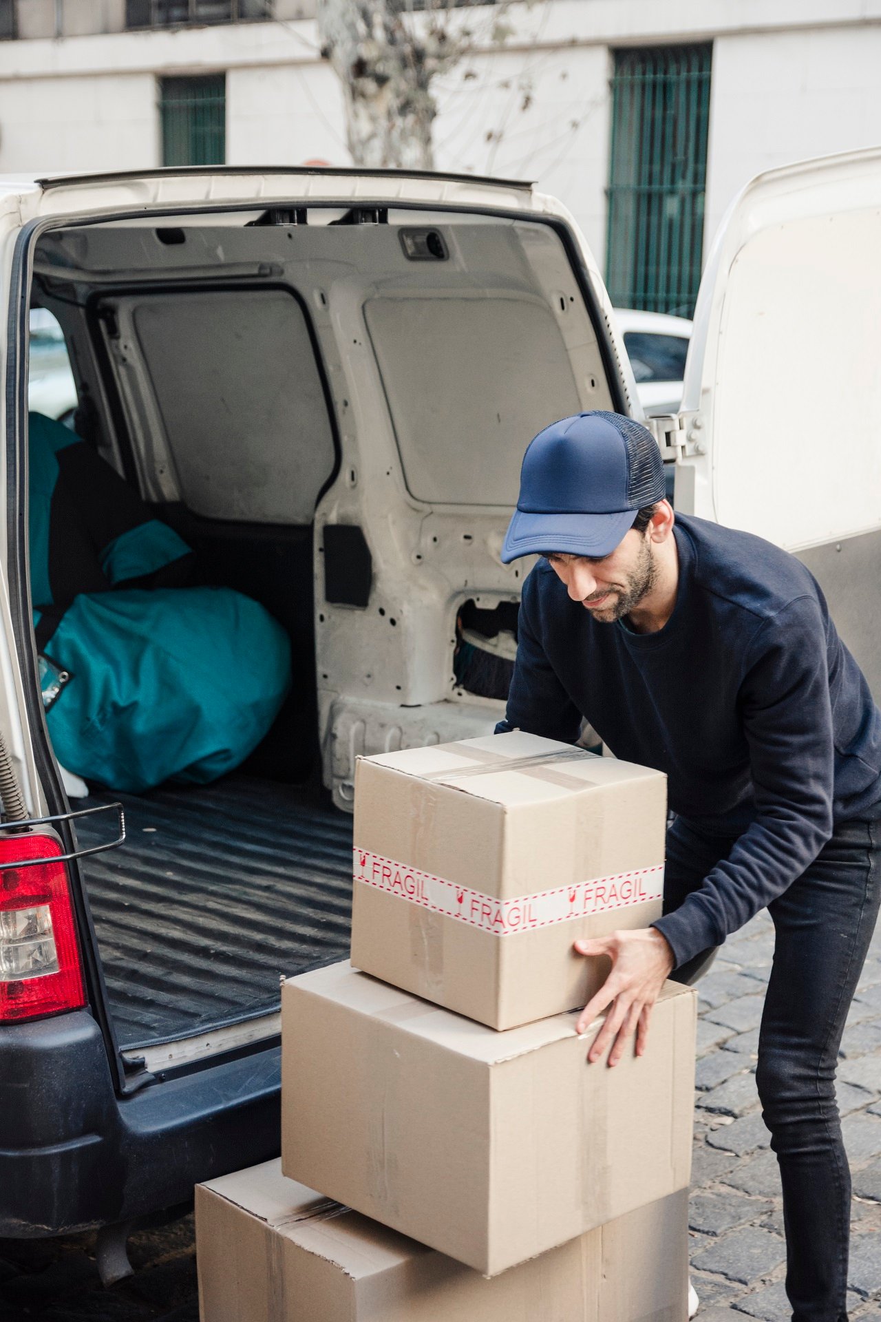 Homem de calça, casaco e boné retira caixas de papelão de furgão com porta aberta. A cena simboliza a importância de entregas regulares para uma boa gestão de fornecedores.